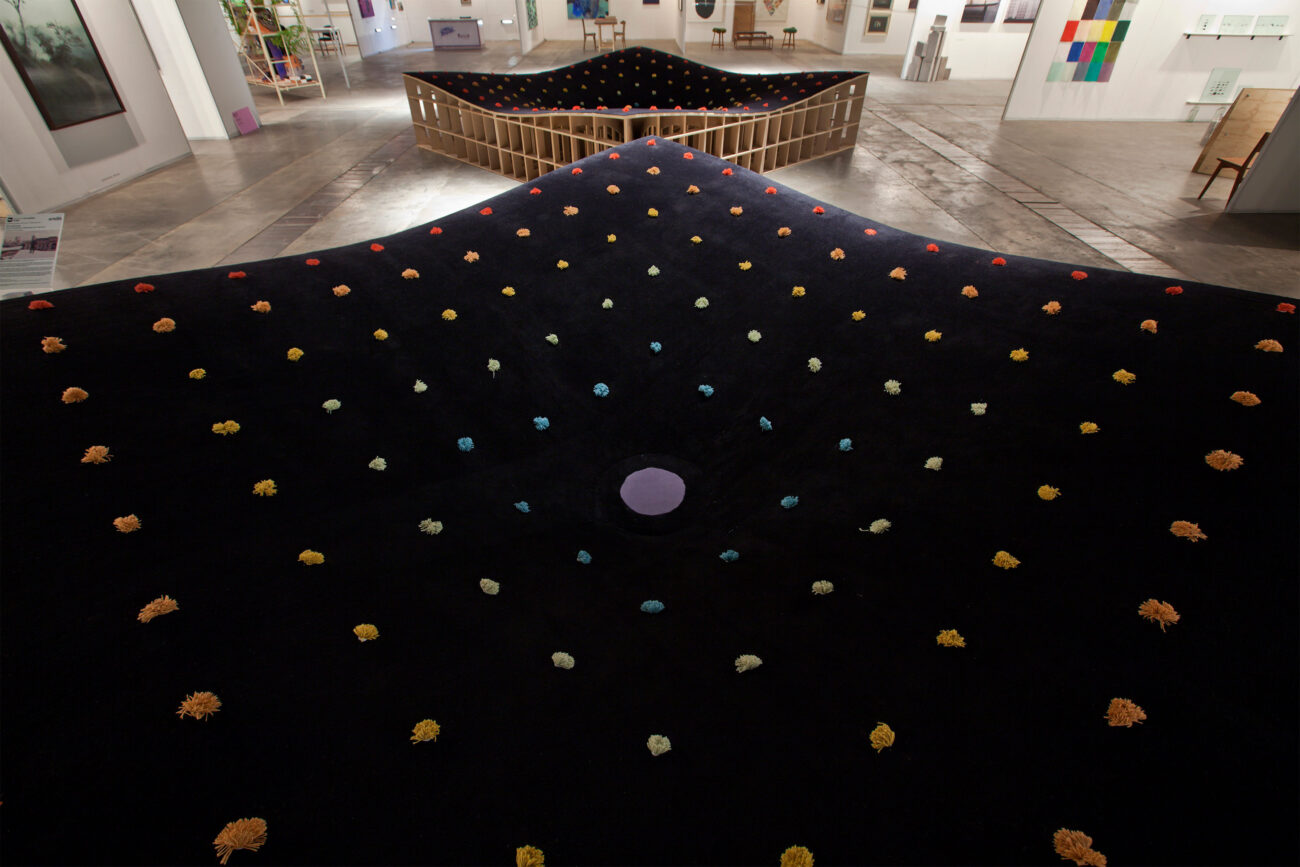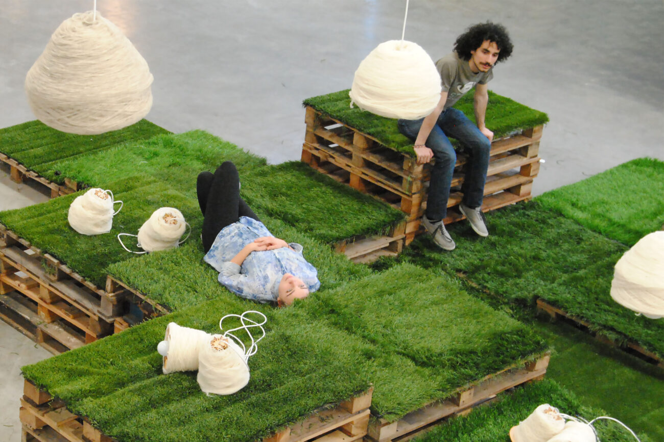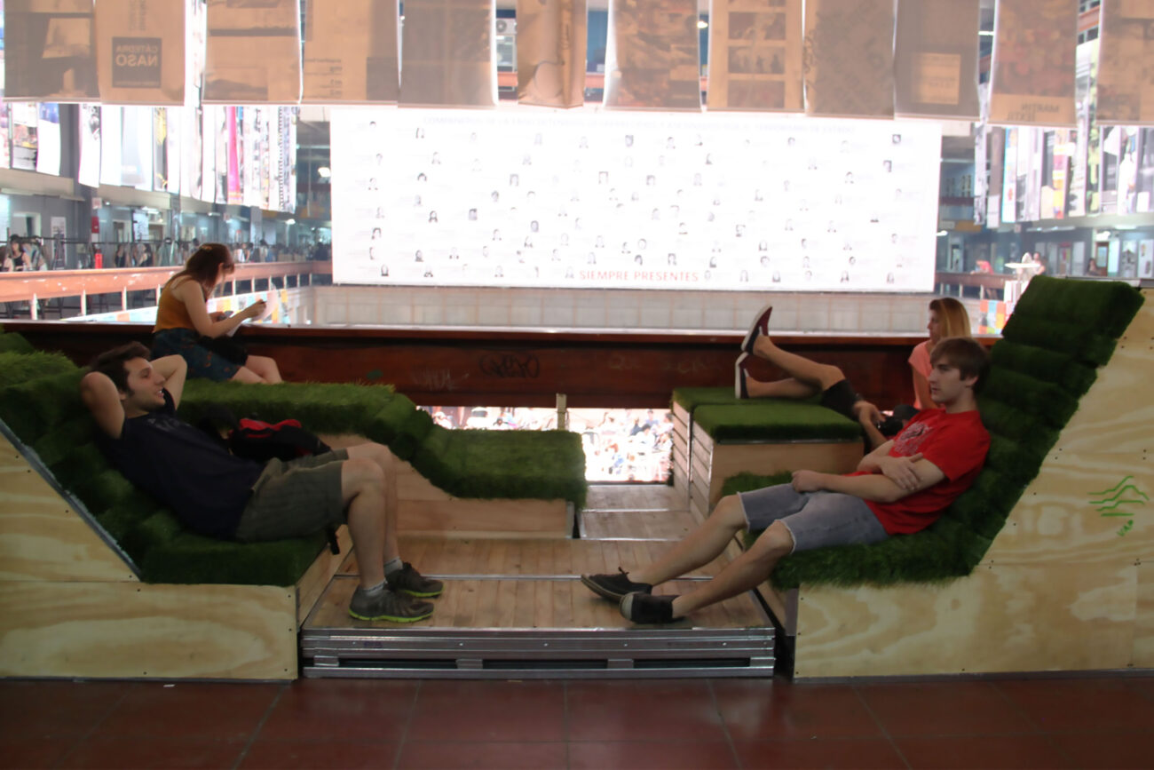 Con pallets disponibles en la feria Exposustenta y saldos de césped sintético profesional, los integrantes de Galpón Estudio desarrollaron un espacio indeterminado con módulos que invitaban a sentarse, descansar o bien utilizarse para exponer objetos. Para las lámparas que completaban la puesta en escena, se aprovechó un subproducto remanente del proceso de fabricación de alfombras:…