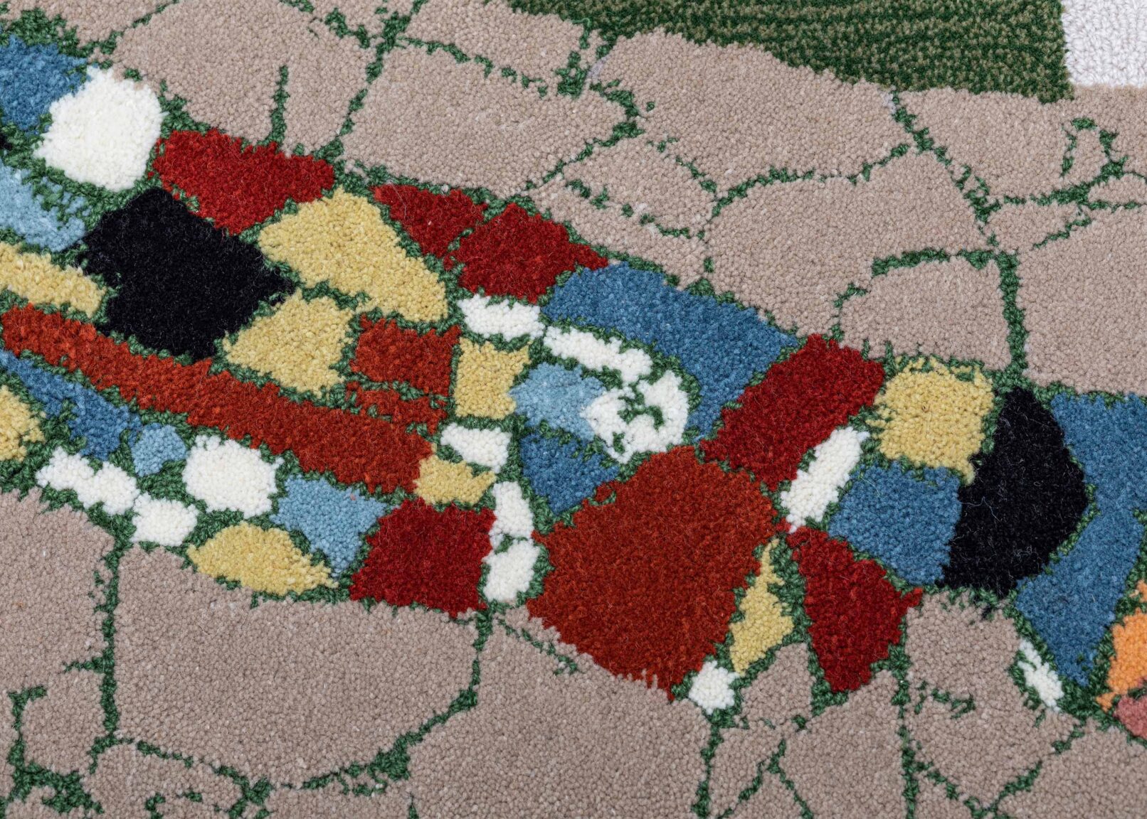 To exhibit it at the Leo Werthein Foundation, the artist invited us to reinterpret her work in a new textile language. The result is a 100% wool tapestry, 480 x 200 cm, which translates the mosaic into a new materiality. It was woven with hand-tufting technique and elaborated with 21 colors, selected from the palette of the original work.
