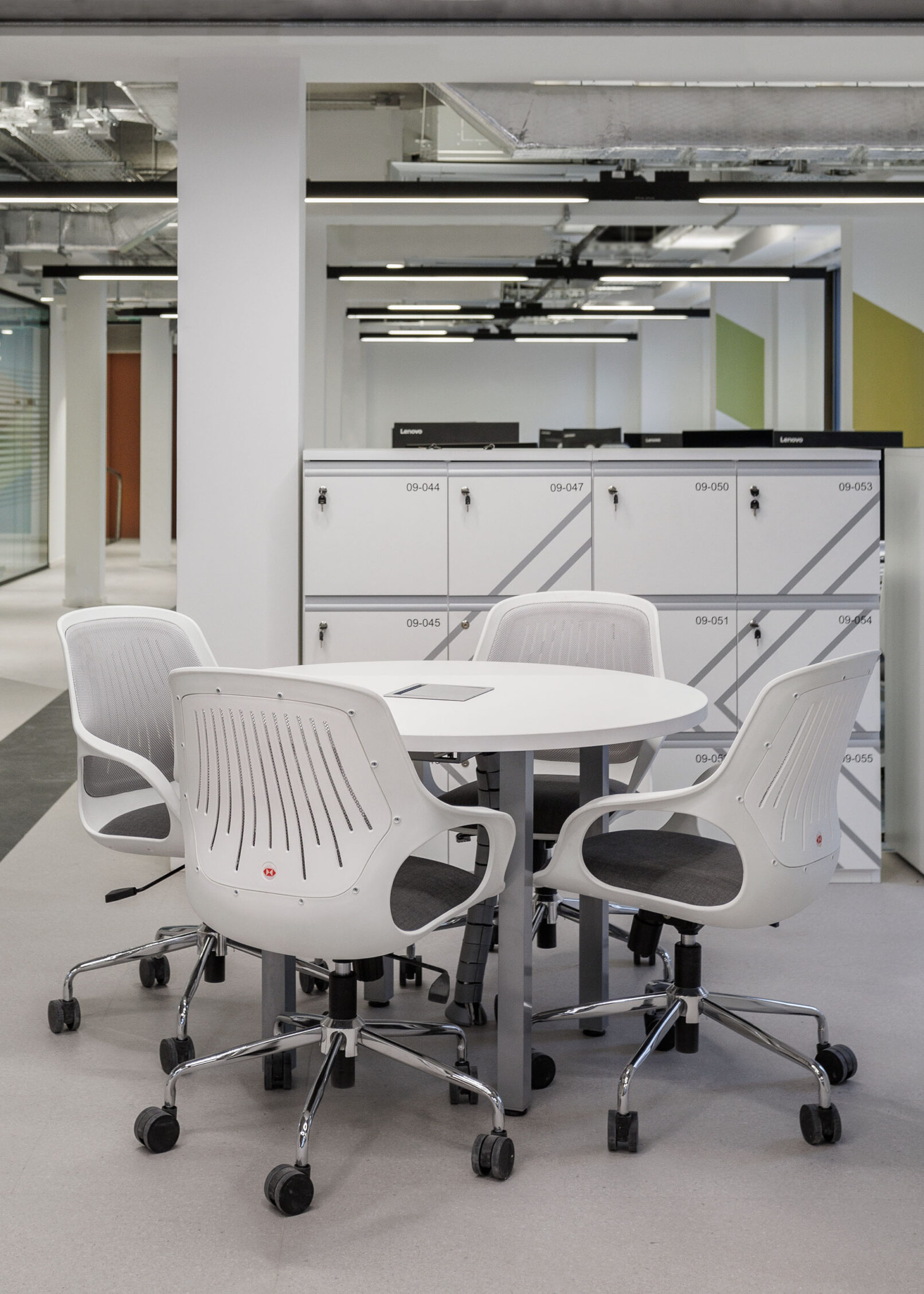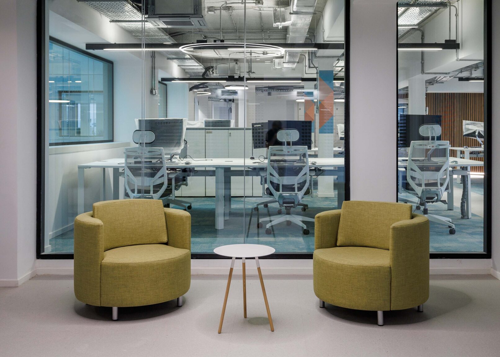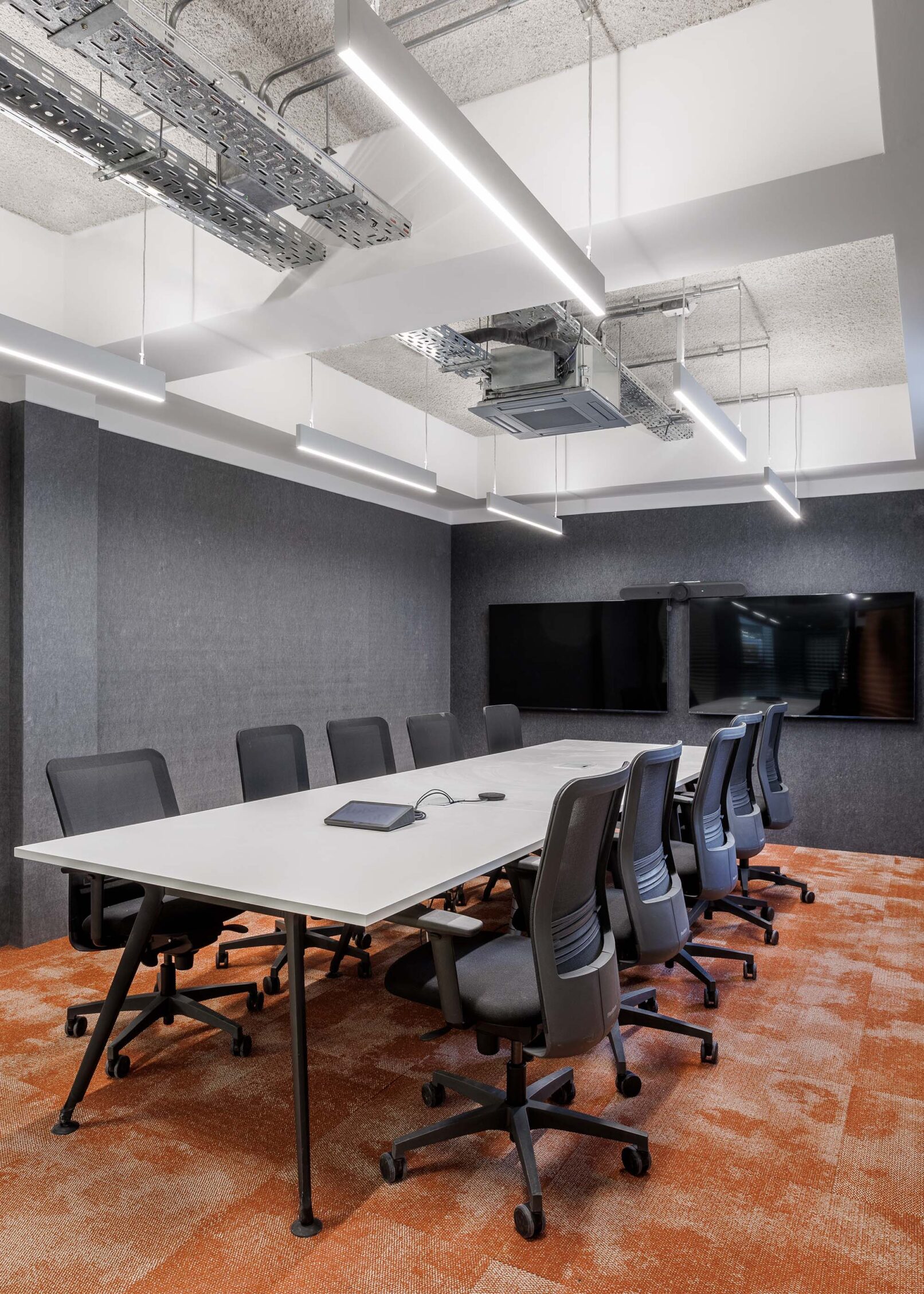 Respecto de los pisos, en los sectores operativos se colocó nuestra alfombra Infinity IF en dos variantes de color, y nuestra línea de pisos vinílicos LINKS, en circulaciones y espacios comunes. De esta manera, se combinaron dos tipologías de superficies diferentes que conviven de manera estética y funcional para sectorizar los espacios.