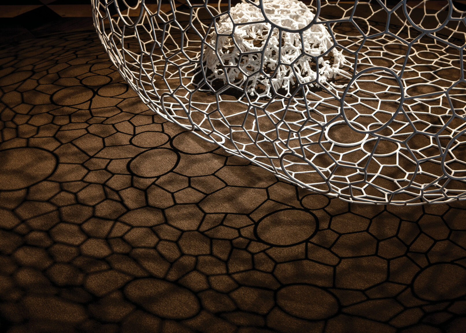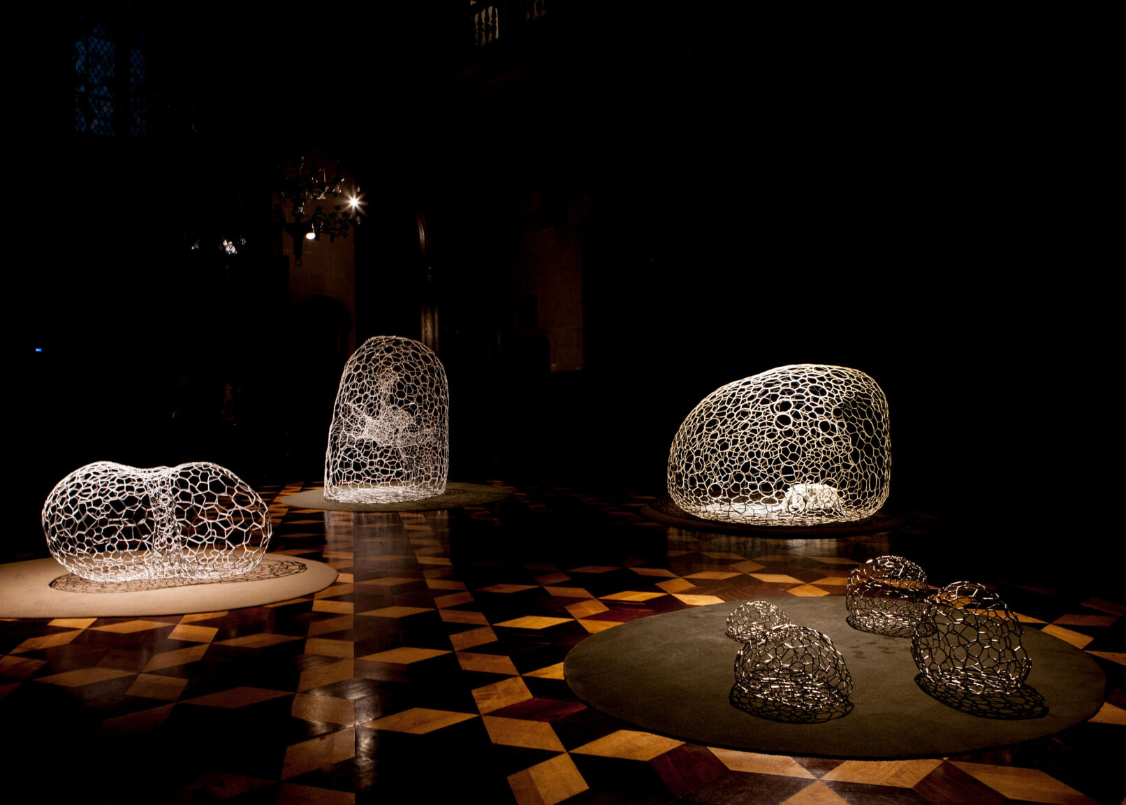 La muestra invitaba al espectador a transitar por dentro de esculturas de crisálidas que representaban diversos seres vivos en una escala descomunal. Acompañamos la exhibición con carpetas de nuestra línea Pallas en tonos marrones y formas irregulares y orgánicas, que sirvieron de base para resaltar el juego de sombras proyectado por las esculturas.